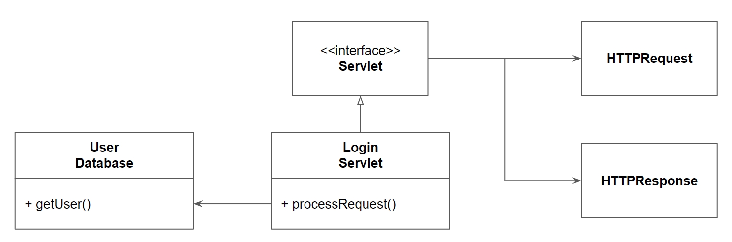 LoginServlet클래스는Servlet인터페이스를 구현하였다.LoginServlet클래스는 내부적으로UserDatabase객체를 끌어쓴다.Servlet인터페이스는HTTPRequest와HTTPResponse객체를 사용한다.