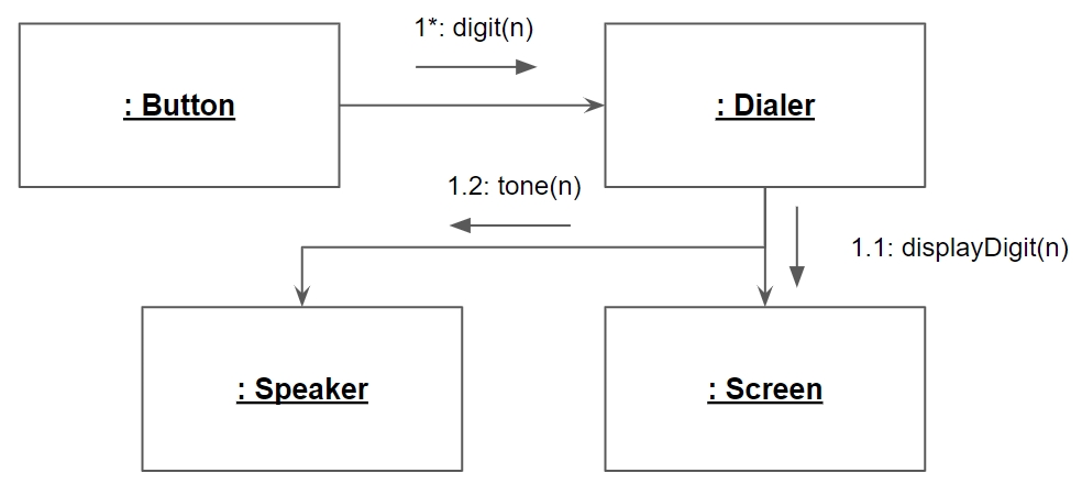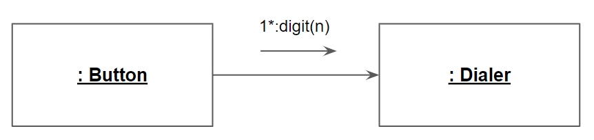 버튼이 눌릴 때마다 이를 감지해서 다이얼을 돌리는 일을 제어하는 객체에 메시지를 보낼 것이라고 상상해보자. 버튼(Button) 객체와 다이얼(Dialer) 객체를 그리고 버튼이 다이얼에 번호 메시지를 여러 개 보내는 것도 고려하여 그렸다.