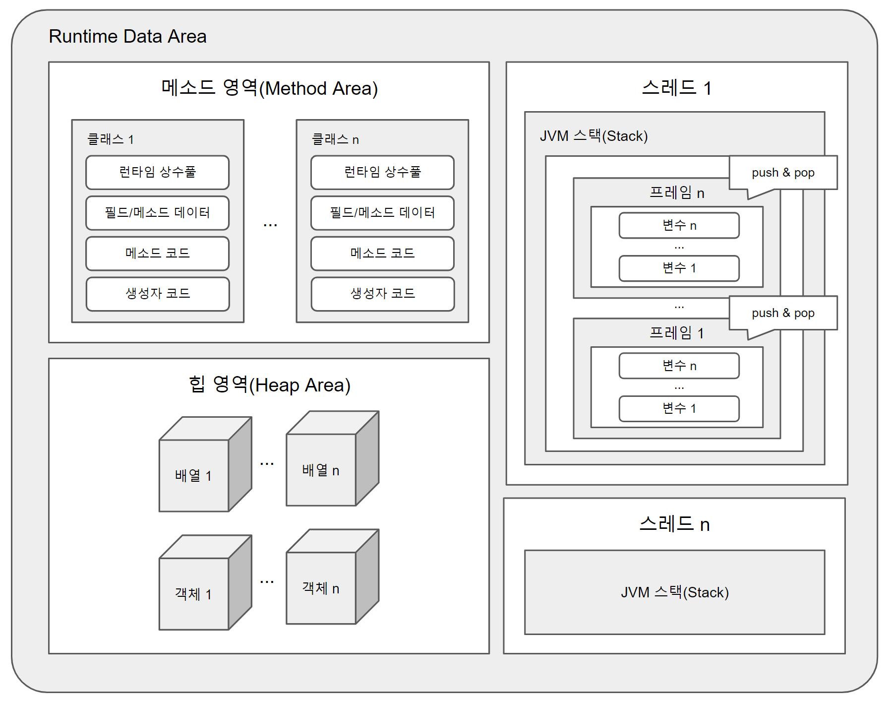 JVM은 운영체제에서 Runtime Data Area 메모리 영역을 할당받아 다음과 같이 세부 영역으로 구분해서 사용한다.