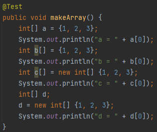 a의 경우가 특별한데, 배열 생성 후 즉시 초기화 할 때만 문법에서new int[]가 생략된다고 이해하면 쉽다.