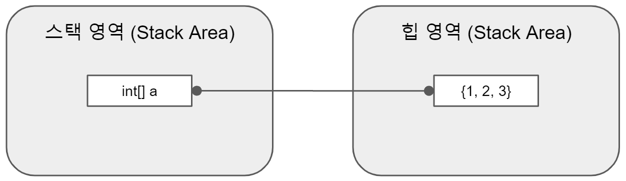 힙 영역에 생긴 배열 객체 내부에서는 배열의 주소마다 힙 영역에 있는 다른 객체를 참조하는 형태가 된다.