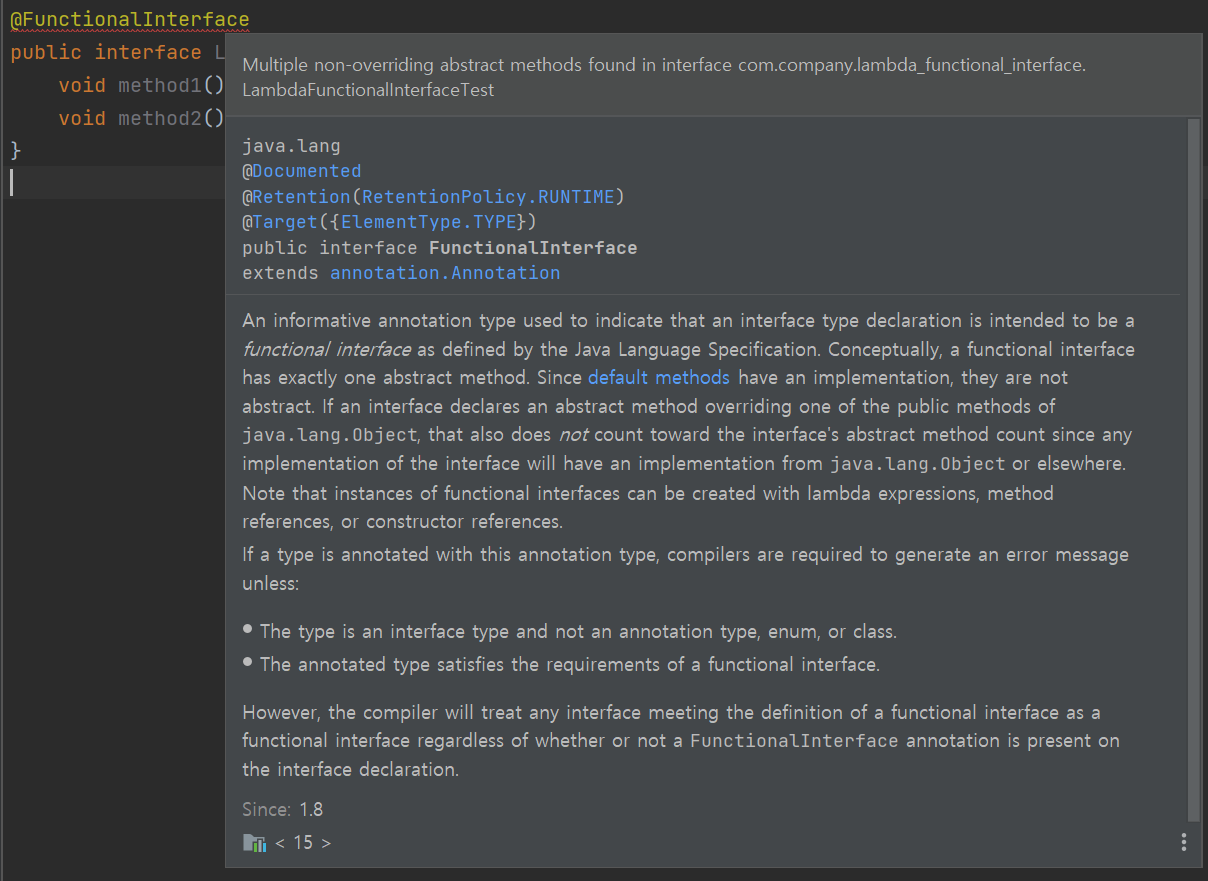 @FunctionalInterface애노테이션을 붙이면, 두 개 이상의 추상 메소드가 선언되지 않도록 컴파일러가 체킹을 해준다.단, 디폴트 메소드 등은 추가로 있어도 무방하다.