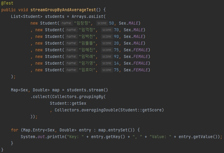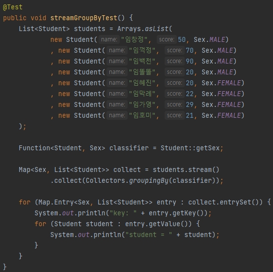 위의 경우에는 key의 타입이 Sex.MALE 혹은 Sex.FEMALE 중 하나가 되며, value의 타입이 List<Student>가 된다.