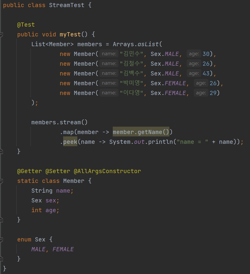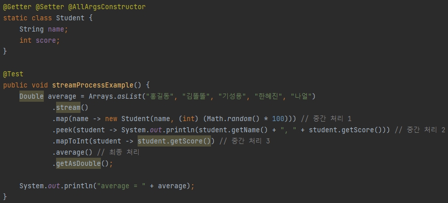 위는 간단히 작성해본 코드인데 map(), peek(), mapToInt()와 같이 필터링, 매핑, 정렬 (+ 반환값이 없는 peek()) 등은 중간처리로 데이터를 가공하는 역할을 한다.