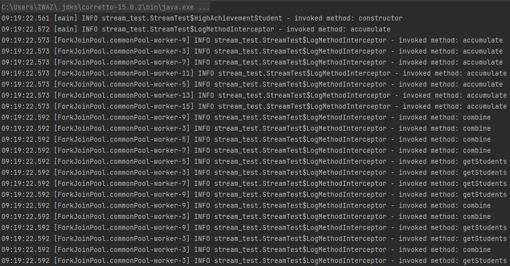 코드에 단순히 .stream() 부분을 .parallelStream()으로 바꾸어주었다. 기존에는 main 스레드에서만 진행되던 작업이 ForkJoinPool을 이용해 처리되는 것을 볼 수 있다. combiner도 잘 호출되고 있다.