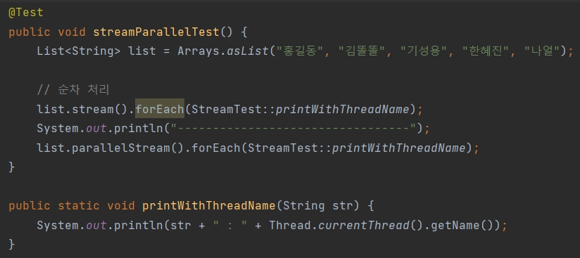 또, .stream()으로 메소드 체인을 시작했더라도 .parallel() 메소드를 통해서 체인을 이어나가면 이어지는 부분을 병렬처리 할 수 있다.