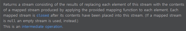 해당 스트림의 각 엘리먼트에 제공된 매핑 함수가 적용되어 그 결과를 가진 스트림을 반환한다. 해당 스트림으로 결과가 위치한 후에 각 매핑된 스트림은