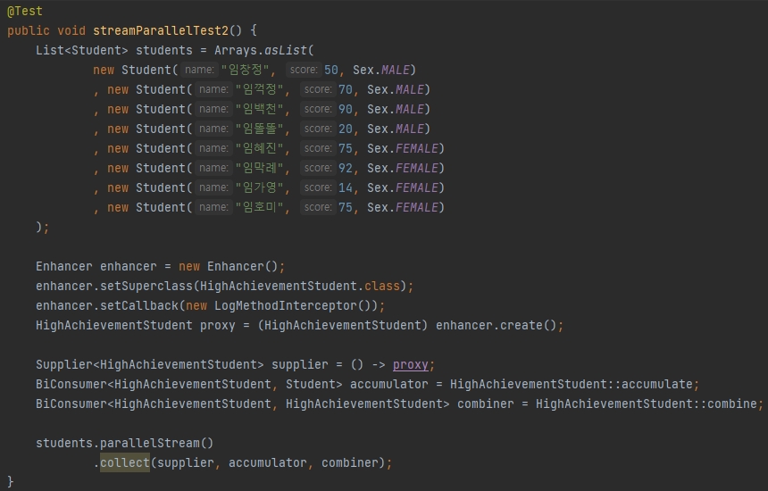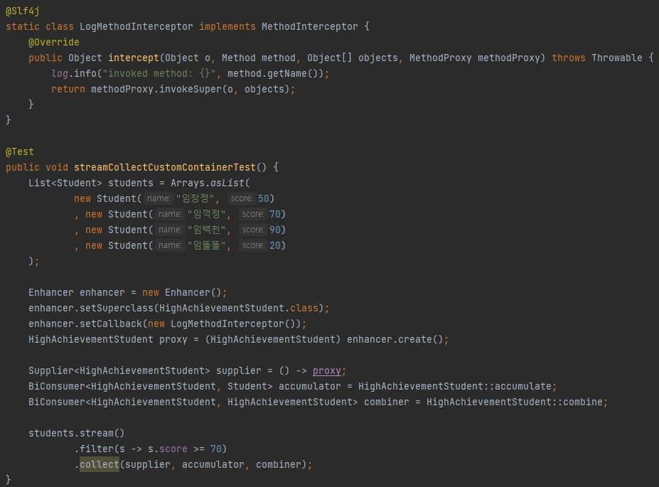 supplier에 쓰인 HighAchievementStudent는 cgLib을 이용한 프록시로 생성되어 메소드 호출 시마다 자신이 호출한 메소드를 출력한다.