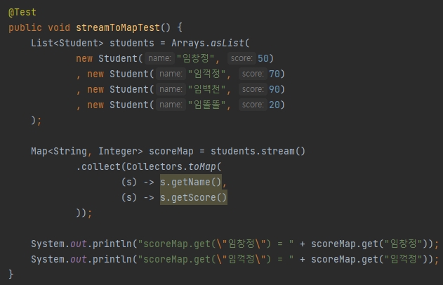 점수가 70점 이상인 학생만 들어갈 수 있게 .filter()를 걸고 .collect() 메소드를 통해 HighAchievementStudent 컨테이너에 담았다.
