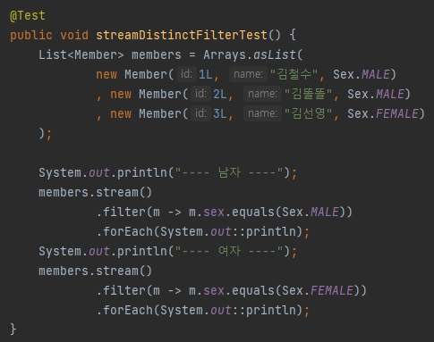 .distinct():Object.equals()가true인 객체를 중복으로 판단하고 제거한다..filter():Predicate수행 결과false인 객체를 제거한다.