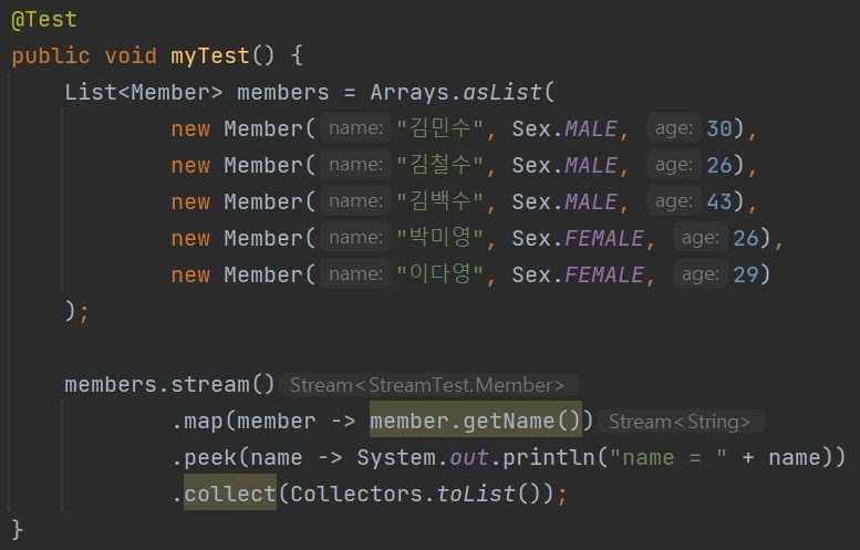 myTest 메소드의 내용은 이전과 동일한데 마지막에 .collect() 메소드만 추가되었다. 그렇게 하니까 .peek() 내부에 위치해있던 처리 내용인 print()가 올바르게 동작한다.