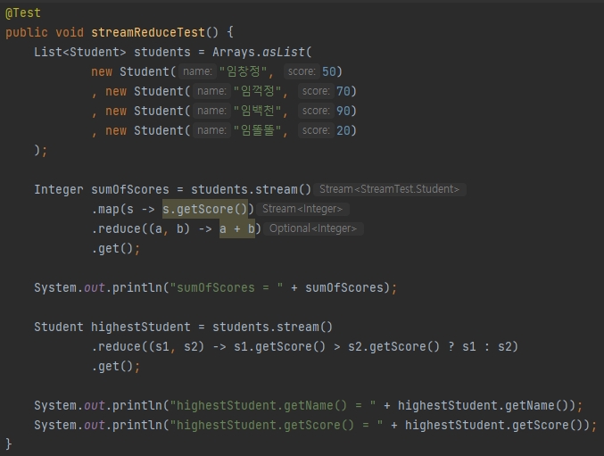 학생들 점수의 총합을 구하는 것과 가장 높은 점수를 가진 학생을 뽑는 예제를 작성해보았다.
