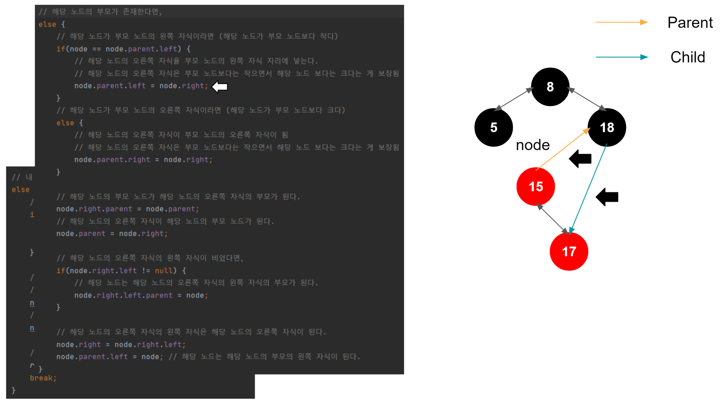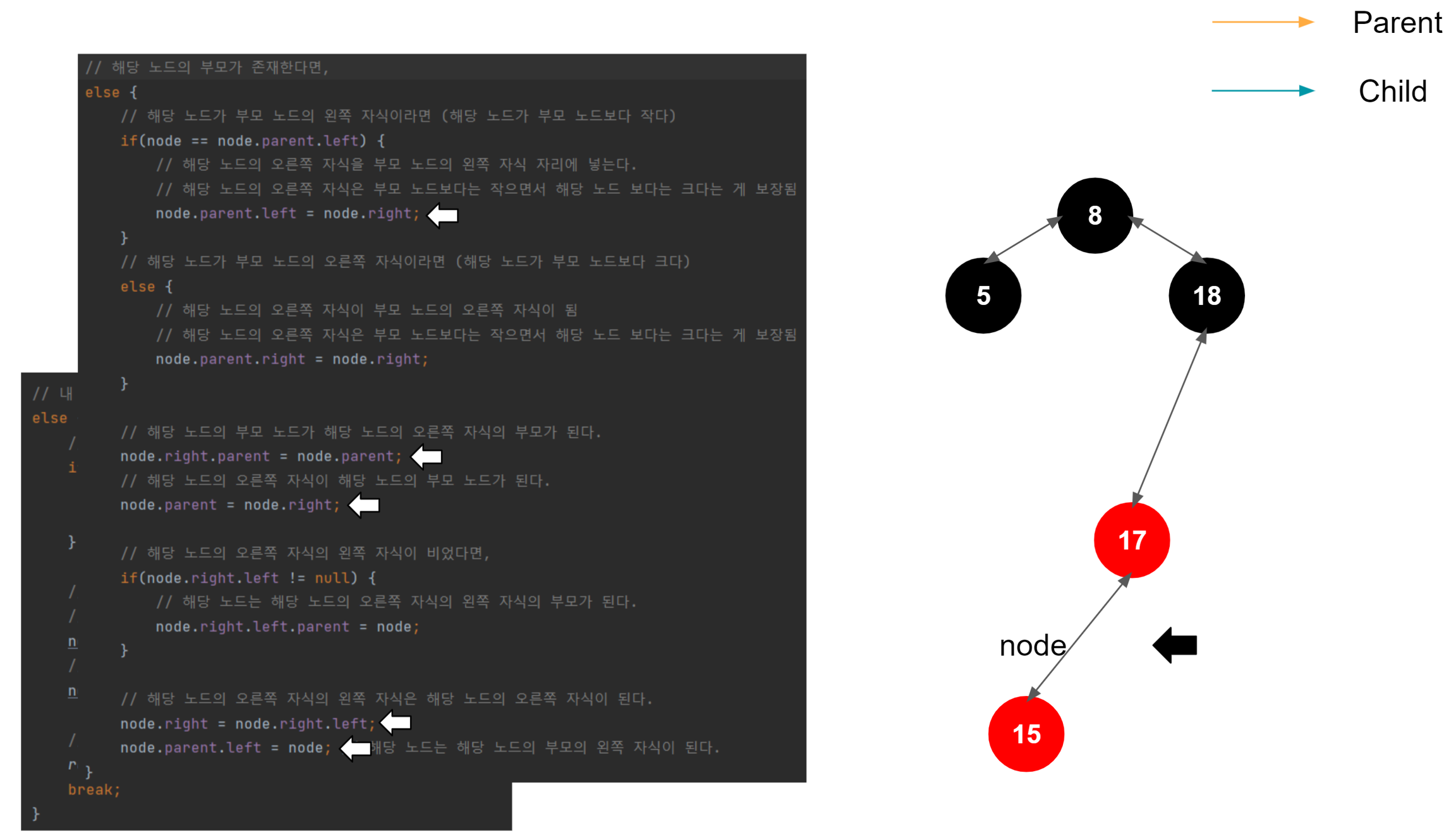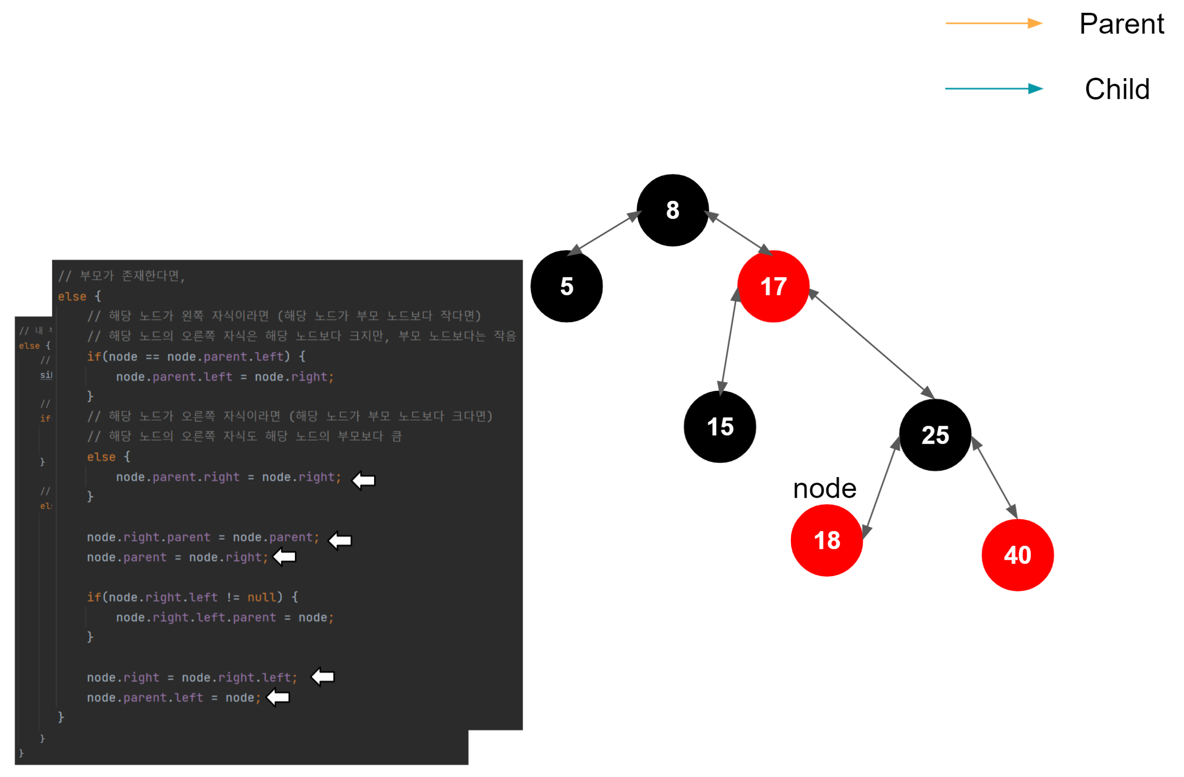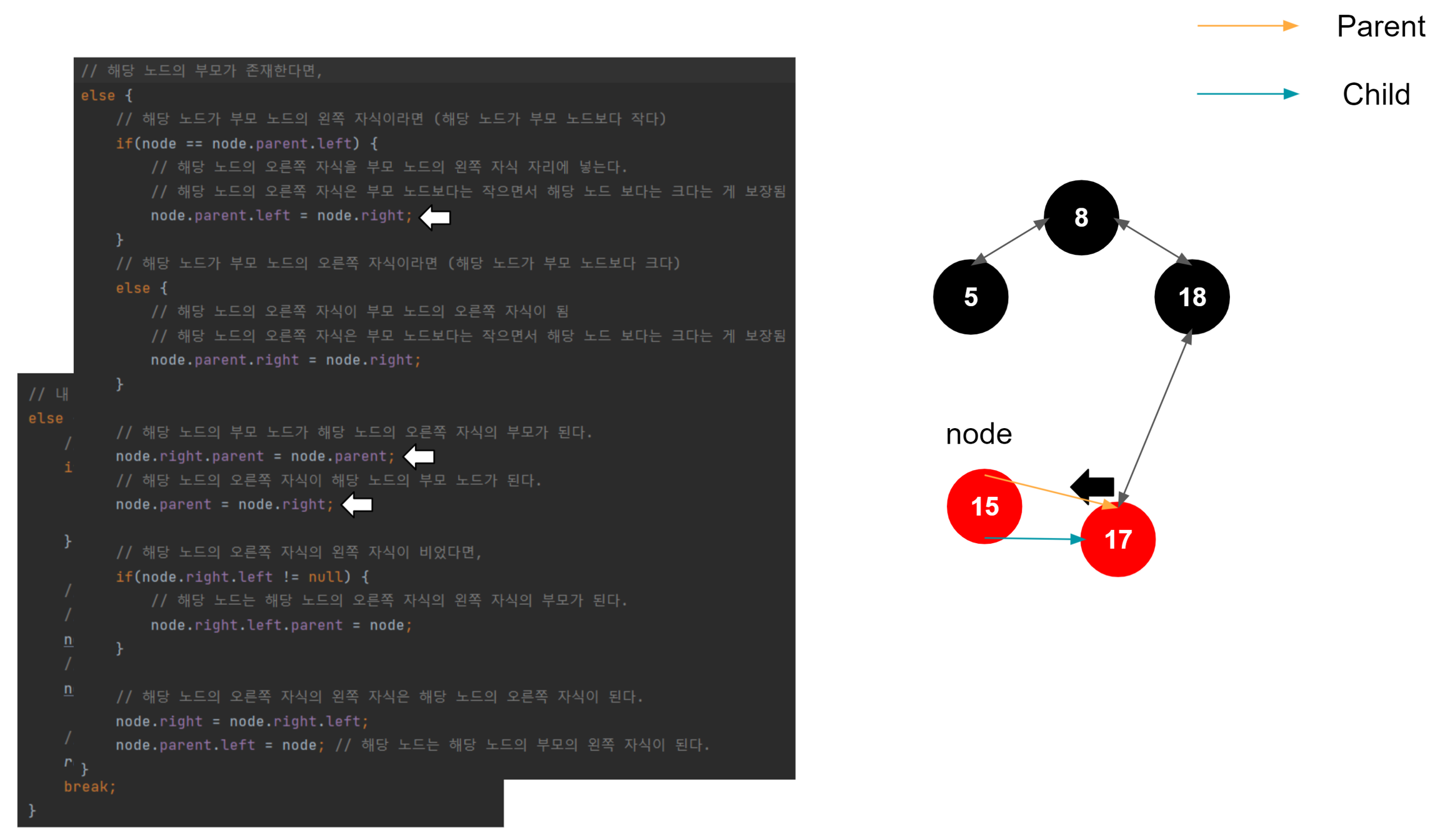 해당 노드가 왼쪽 자식일 때, 해당 노드의 왼쪽 자식이 부모의 왼쪽 자식이 된다. 이게 일어나는 이유는, 이진트리의 규칙을 따라서 삽입되었다고 가정했을 때, 1. 노드가 왼쪽 자식이라면 부모 노드보다 작다는 것이 보장된다. (부모 노드 > 노드) 2. 노드가 가진 오른쪽 자식은 노드보다는 크지만, 노드의 부모 노드보다는 작은 것이 보장된다. (부모 노드 > 노드의 오른쪽 자식 > 노드) 3. 결국 노드의 오른쪽 자식이 부모 노드의 왼쪽 자식으로 편입되어도 아무런 문제가 없다.