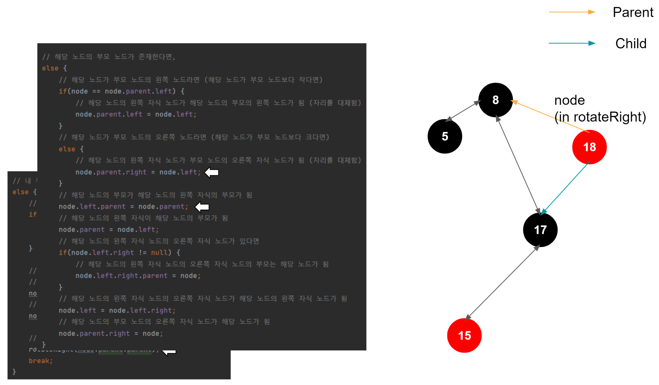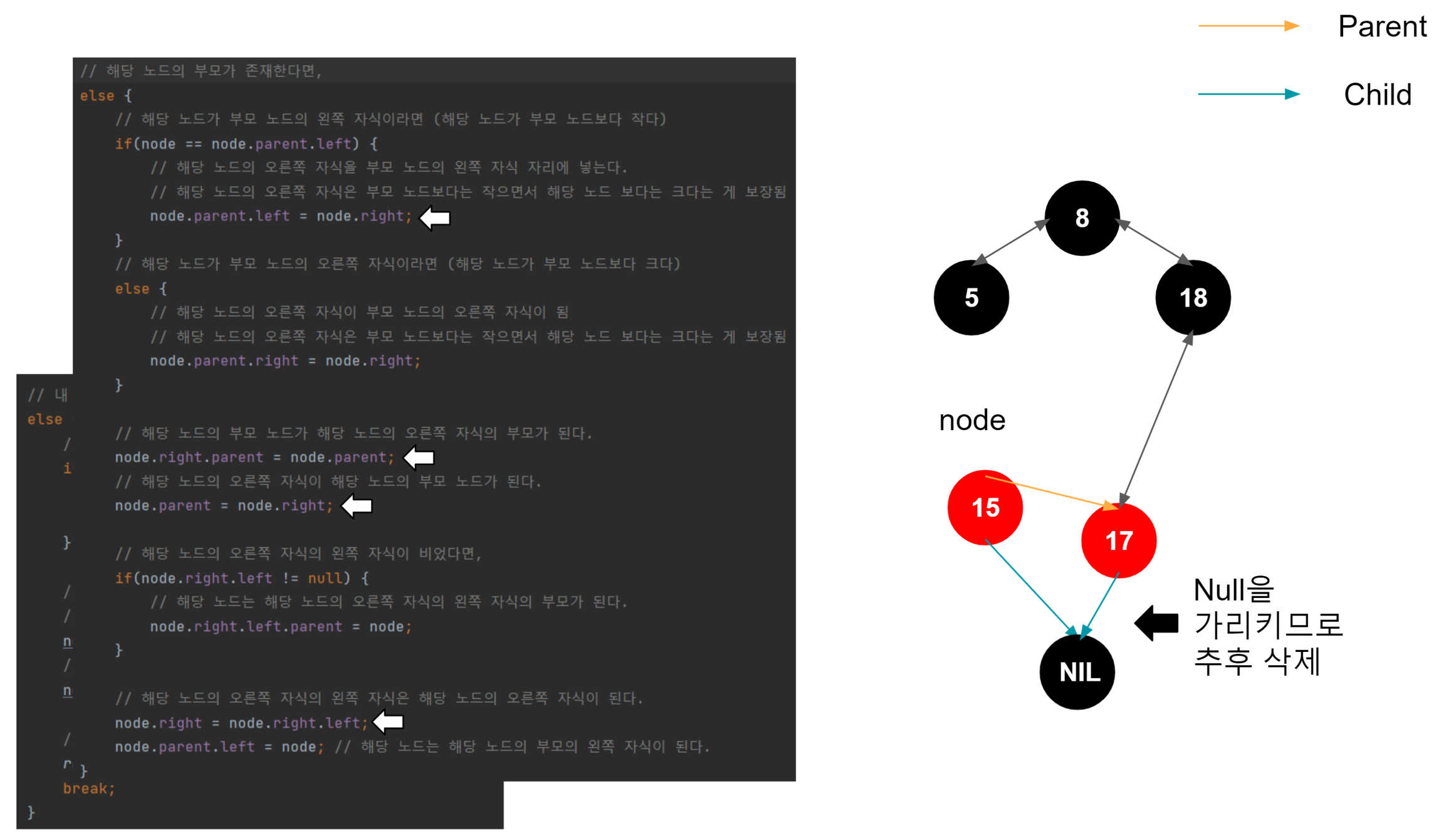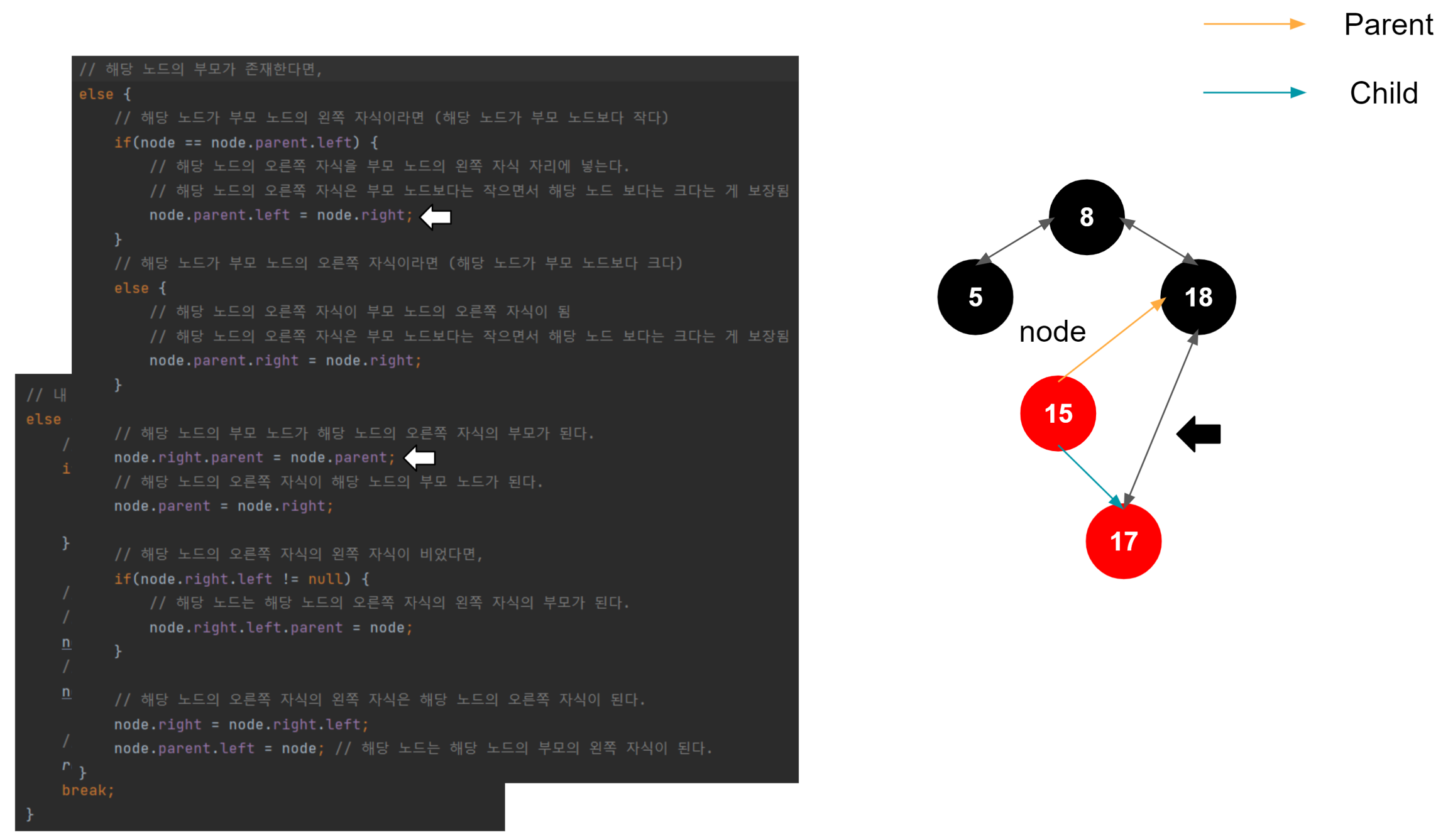 해당 노드가 왼쪽 자식일 때, 해당 노드의 왼쪽 자식이 부모의 왼쪽 자식이 된다. 이게 일어나는 이유는, 이진트리의 규칙을 따라서 삽입되었다고 가정했을 때, 1. 노드가 왼쪽 자식이라면 부모 노드보다 작다는 것이 보장된다. (부모 노드 > 노드) 2. 노드가 가진 오른쪽 자식은 노드보다는 크지만, 노드의 부모 노드보다는 작은 것이 보장된다. (부모 노드 > 노드의 오른쪽 자식 > 노드) 3. 결국 노드의 오른쪽 자식이 부모 노드의 왼쪽 자식으로 편입되어도 아무런 문제가 없다.