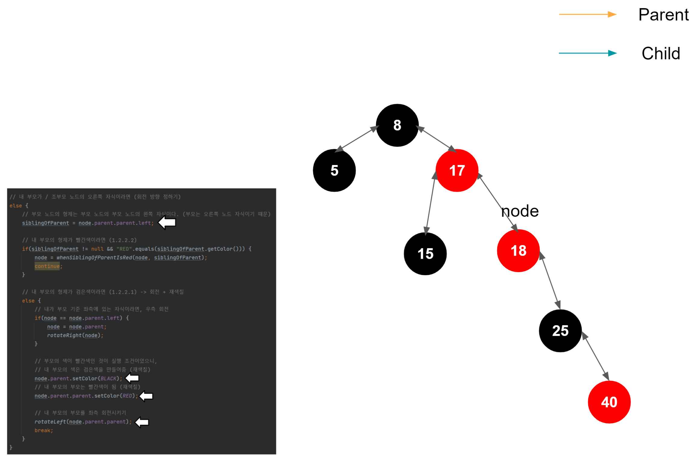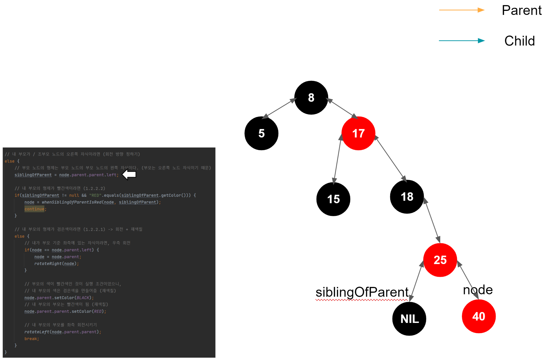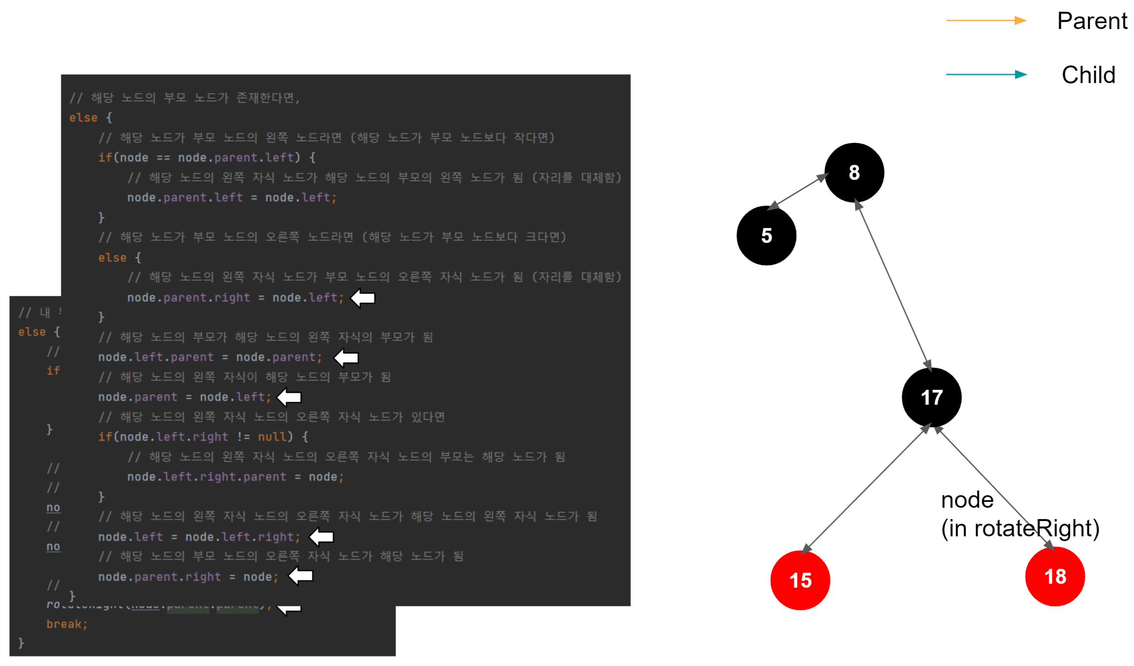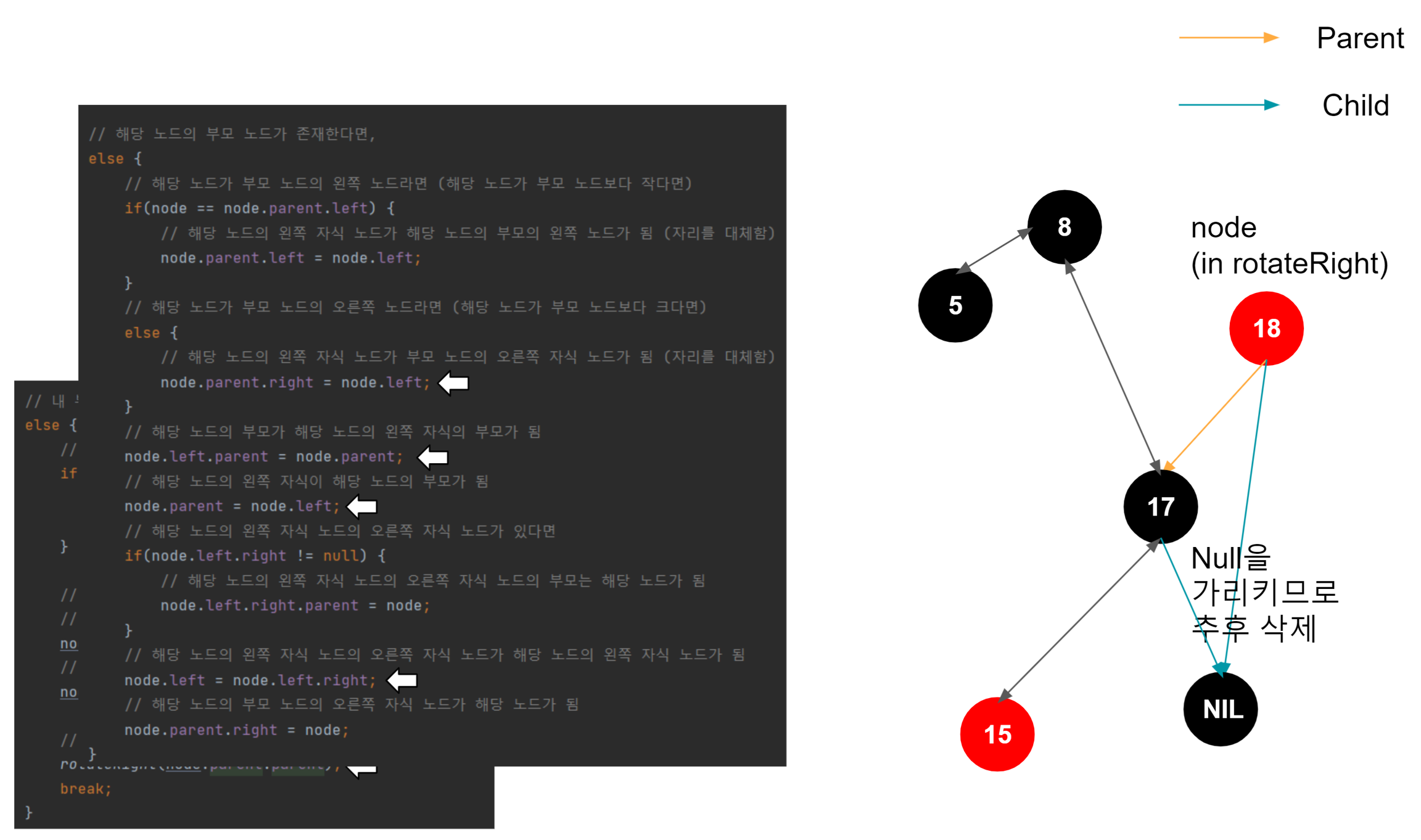 해당 노드가 왼쪽 자식일 때, 해당 노드의 왼쪽 자식이 부모의 왼쪽 자식이 된다. 이게 일어나는 이유는, 이진트리의 규칙을 따라서 삽입되었다고 가정했을 때, 1. 노드가 왼쪽 자식이라면 부모 노드보다 작다는 것이 보장된다. (부모 노드 > 노드) 2. 노드가 가진 오른쪽 자식은 노드보다는 크지만, 노드의 부모 노드보다는 작은 것이 보장된다. (부모 노드 > 노드의 오른쪽 자식 > 노드) 3. 결국 노드의 오른쪽 자식이 부모 노드의 왼쪽 자식으로 편입되어도 아무런 문제가 없다.