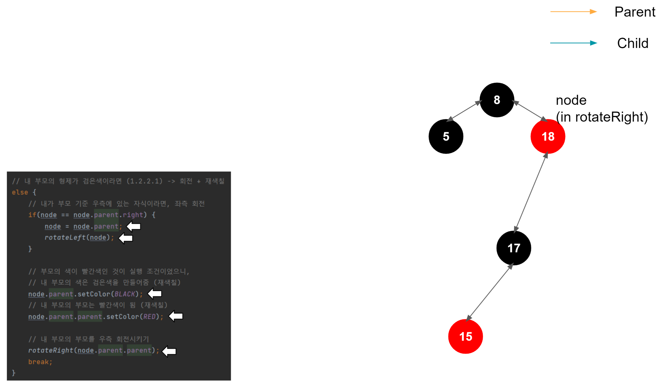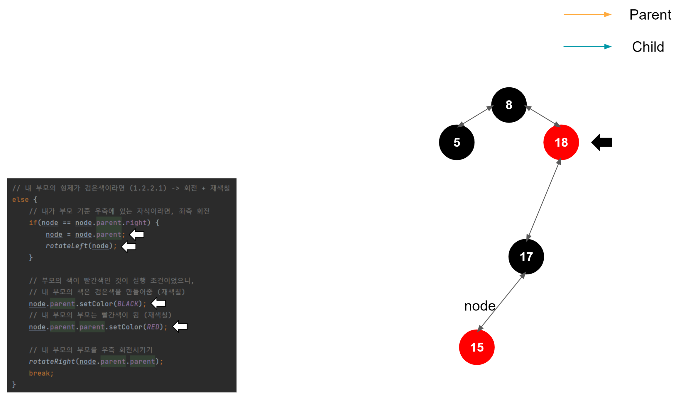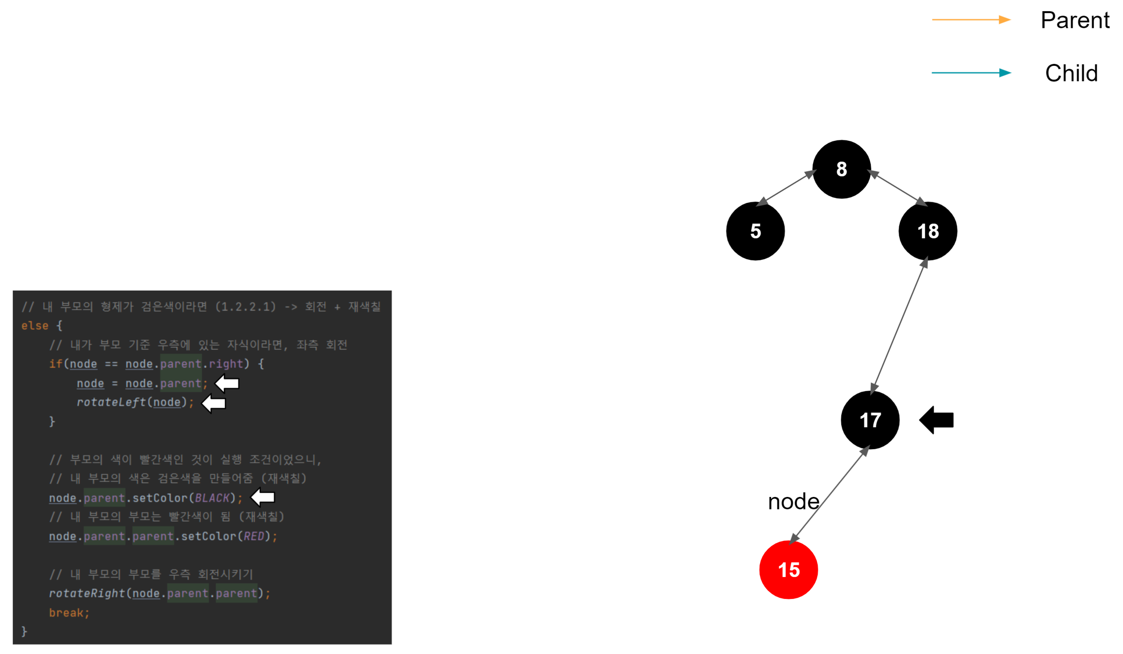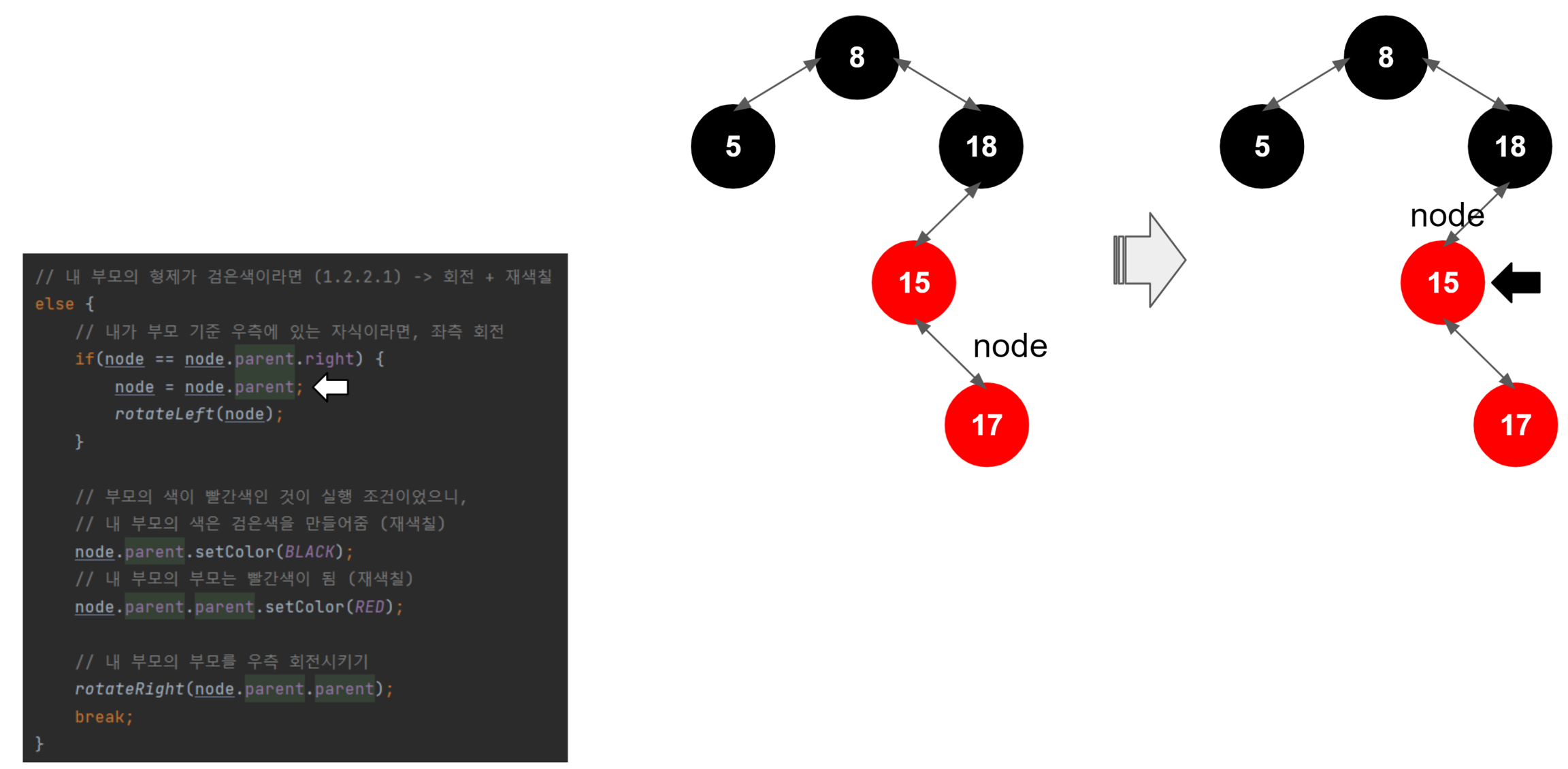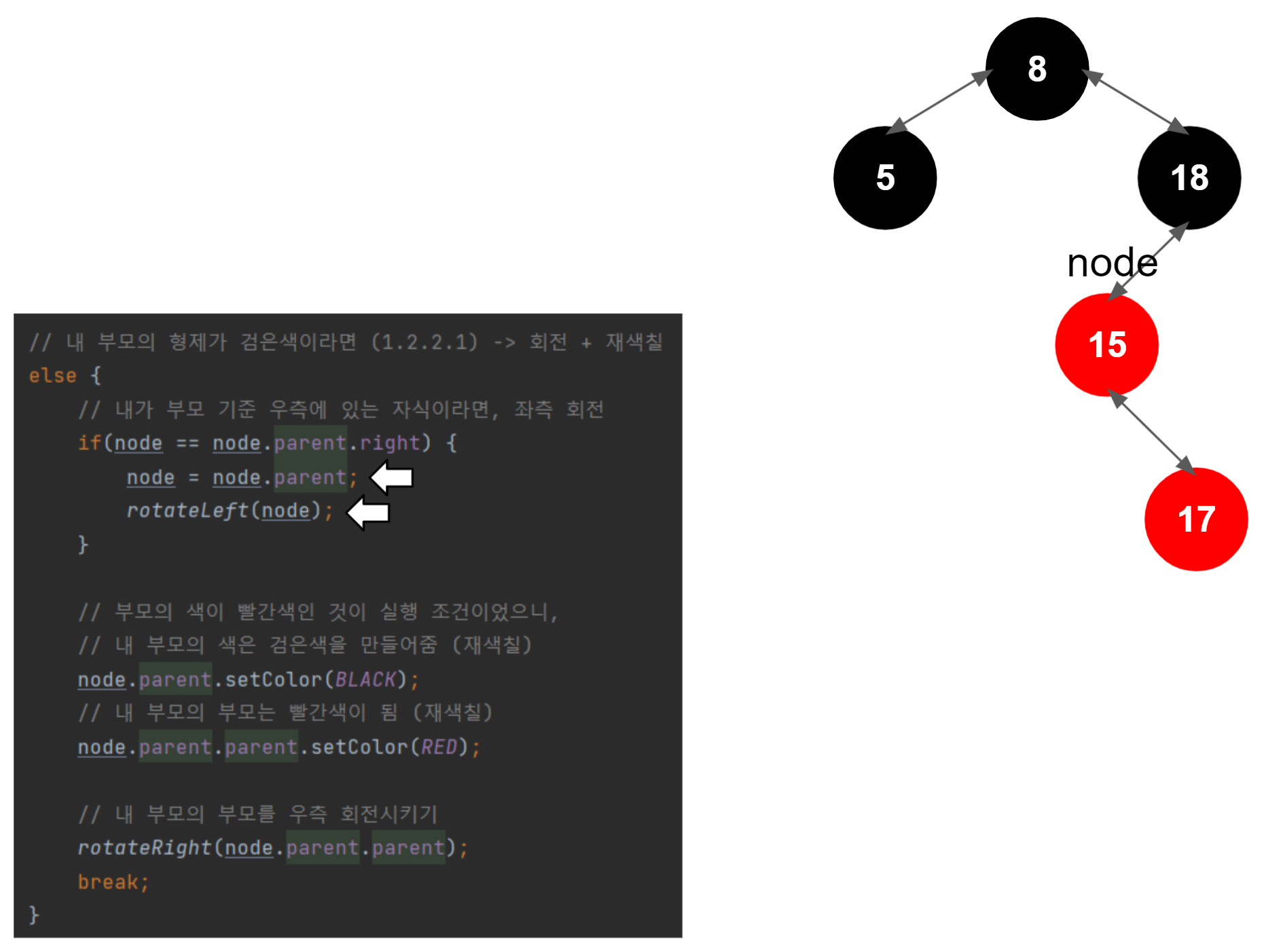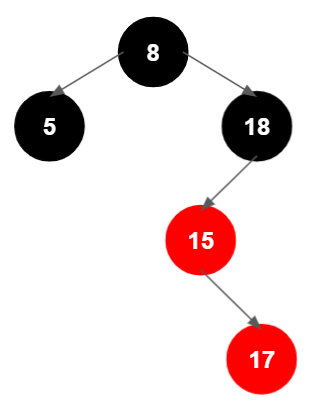 여기까지가 좌측 회전의 끝이다. 결과적으로 18과 가장 차이가 적게 나는 17이 왼쪽 자식 노드로 올라왔고, 15는 17의 자식 노드가 되었다.