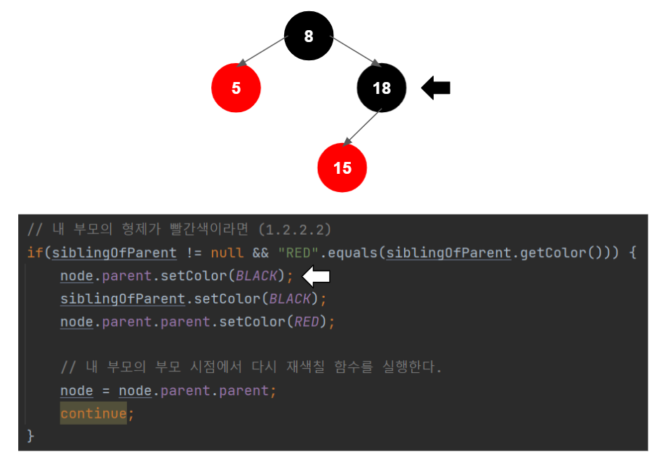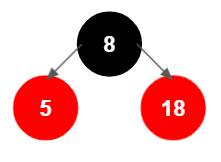 그런데, 위의 모습은 새 노드 부모(18)의 형제가 빨간색이므로, 삽입 절차 중 1.2.2.2에 해당한다. 그러므로 재색칠을 한다.