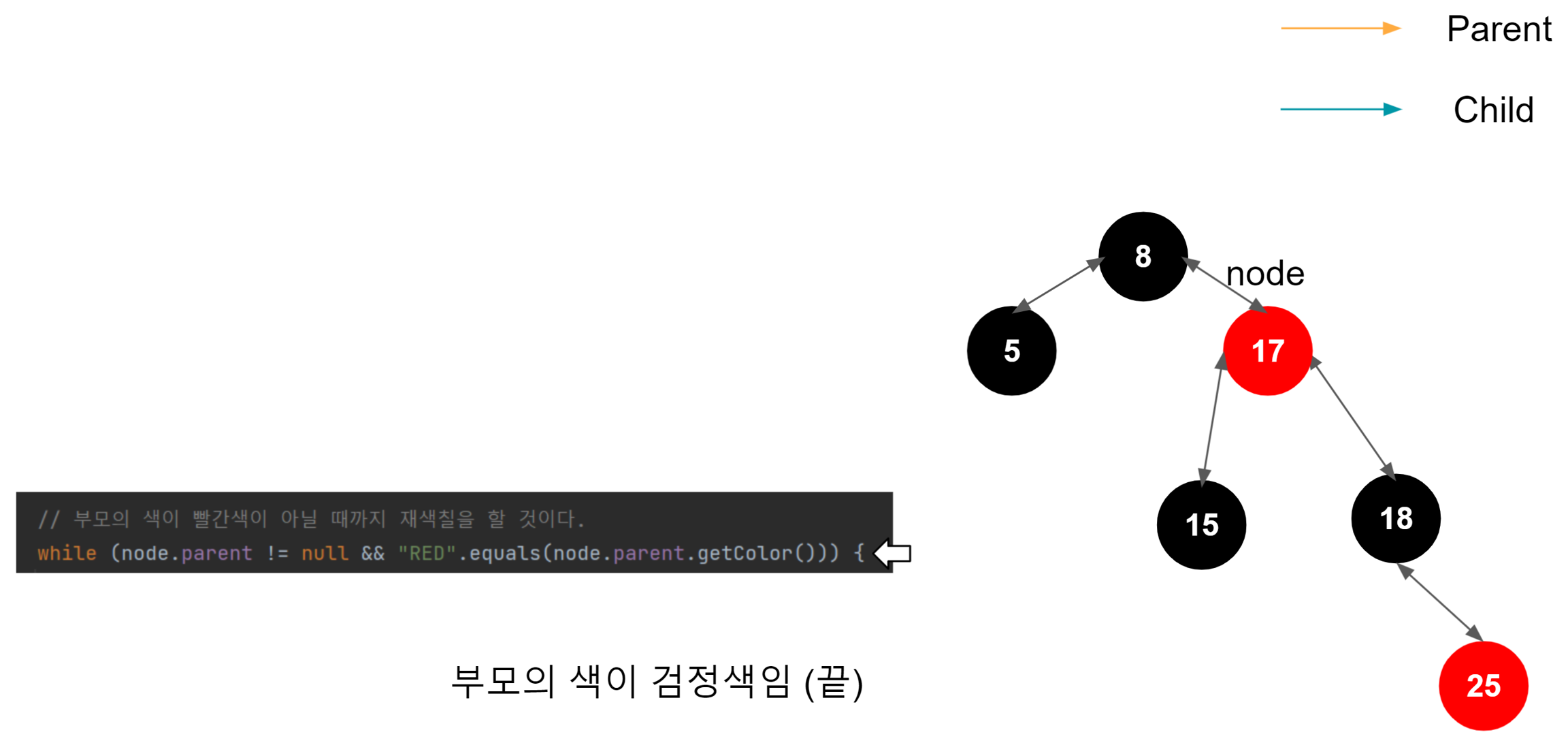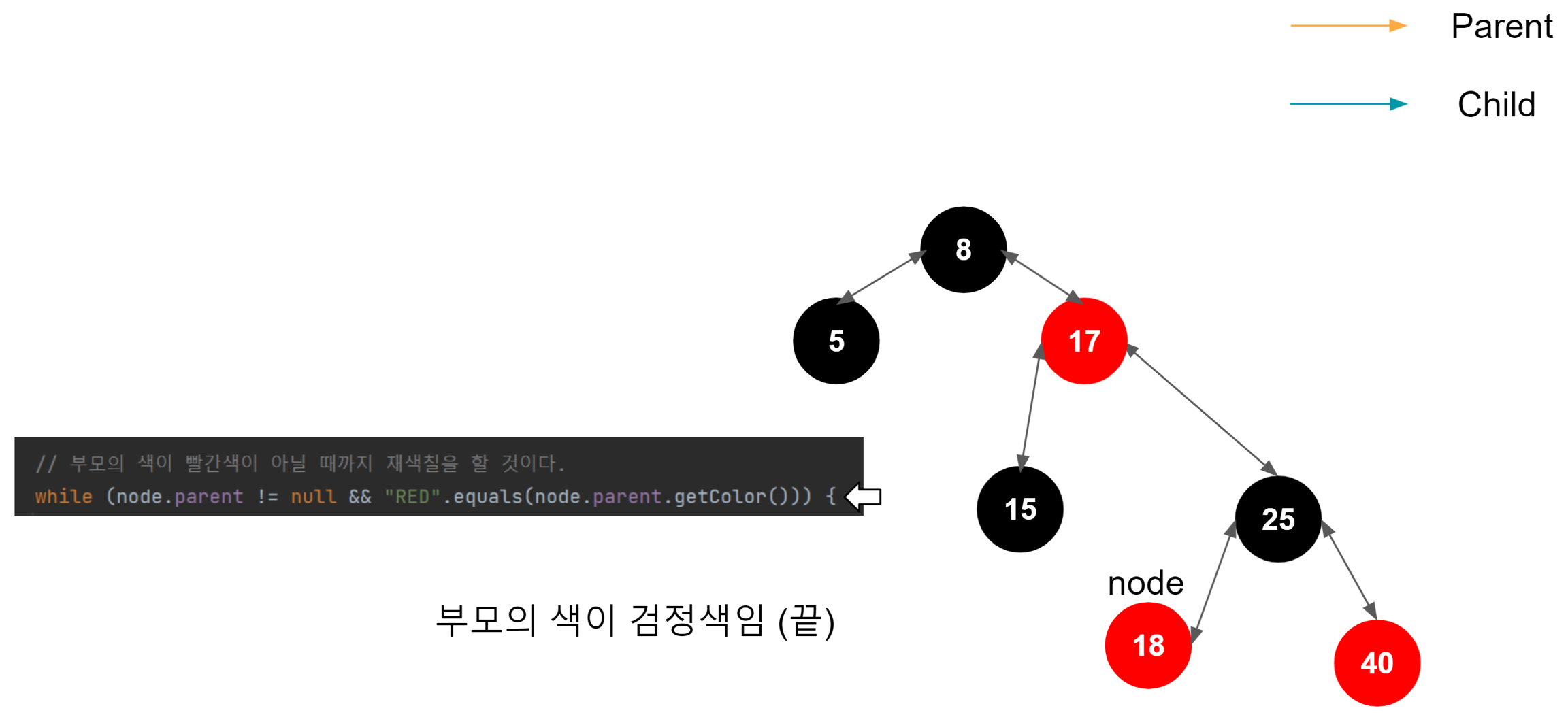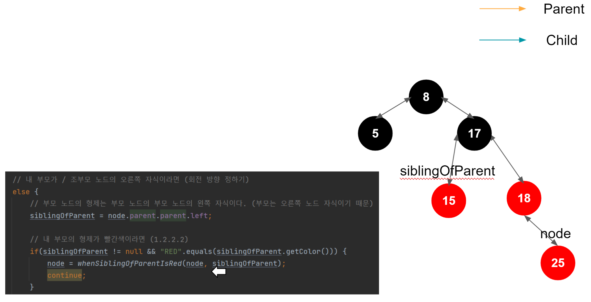 새 노드의 부모가 빨간색이면, 새 노드의 부모의 형제를 확인한다.