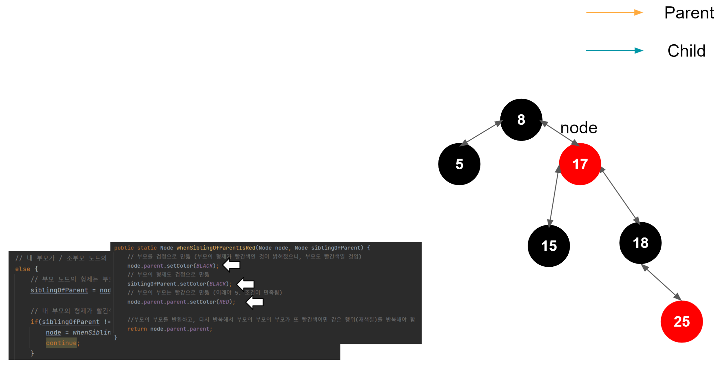 노드의 부모의 형제가 빨간색이라면 현재 노드의 부모와 부모의 형제의 height 차이는 없게 된다. 왜냐하면 레드 블랙 트리 특성상 루트 노드에서 리프 노드까지 가는 도중 만나는 검은색 노드의 숫자는 같아야 하기 때문이다.